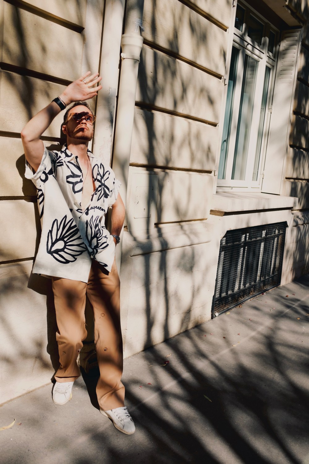For this look I wanted to create a very relaxed summer silhouette, achieved thanks to this oversized Jacquemus linen shirt with flower print and large Feng Chen Wang trousers.
